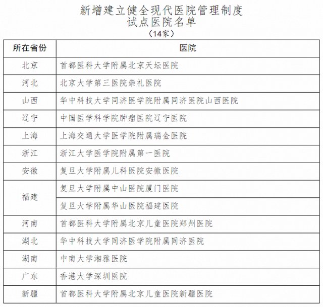 为贯彻落实《国务院办公厅关于建立现代医院管理制度的指导意见》(国办发〔2017〕67号)、《国务院办公厅关于推动公立医院高质量发展的意见》(国办发〔2021〕18号)和《区域医疗中心建设试点工作方案》(发改社会〔2019〕1670号)等有关文件要求,加快建立健全现代医院管理制度,决定新增首都医科大学附属北京天坛医院等14家医院为建立健全现代医院管理制度试点医院。